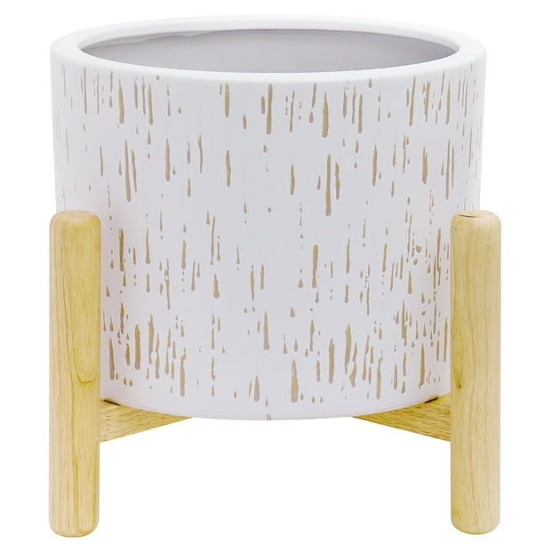 Better Homes Gardens Ceramic Round Ceramic And Wood Planter Stand Set Walmart Com